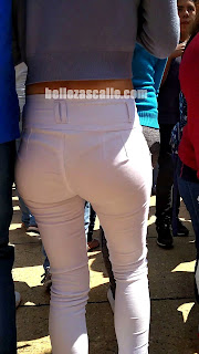 Fotos de chica nalgona captada en la calle mostrando sus sexys curvas en unos pantalones blancos transparentes, ella los usa muy apretados y se le notan unas ricas nalgas redondas y paraditas, también se le marca la tanga, el novio la lleva abrazada todo el tiempo, no vaya hacer que se la roben. Fotos Dulcesito.